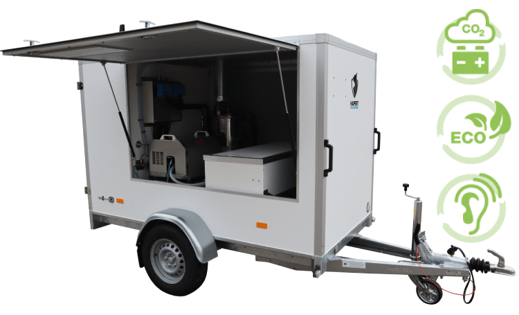 Doordat de installatie in een aanhanger is gebouwd, kan de hogedruktrailer eenvoudig worden vervoerd naar verschillende werklocaties. Hierdoor is de machine geschikt voor zowel korte reinigingsklussen als grotere projecten waarbij emissievrij werken vereist is.